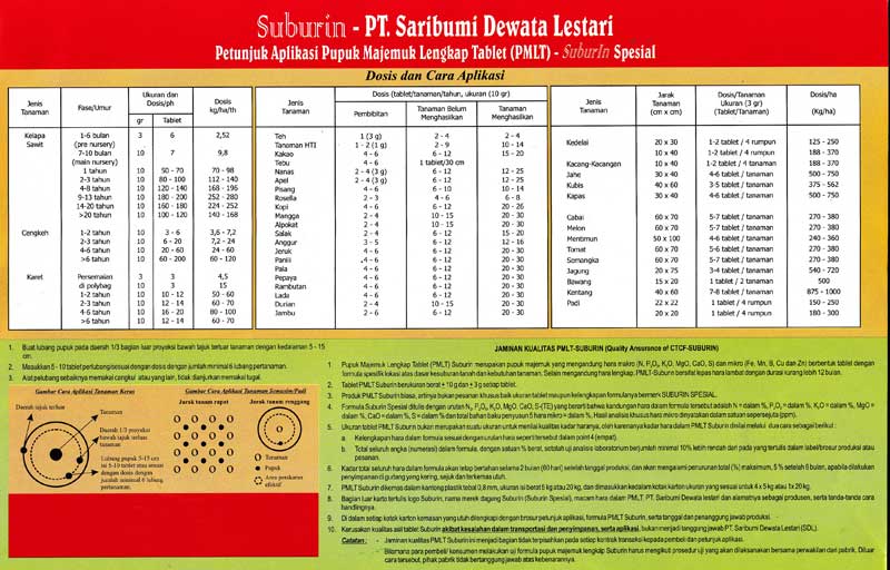 Pupuk Majemuk Lengkap Tablet (PMLT) Suburin merupakan pupuk majemuk yang mengandung hara makro (N, P2O5, K2O, MgO, CaO, S) dan mikro (Fe, Mn, B, Cu dan Zn) berbentuk tablet